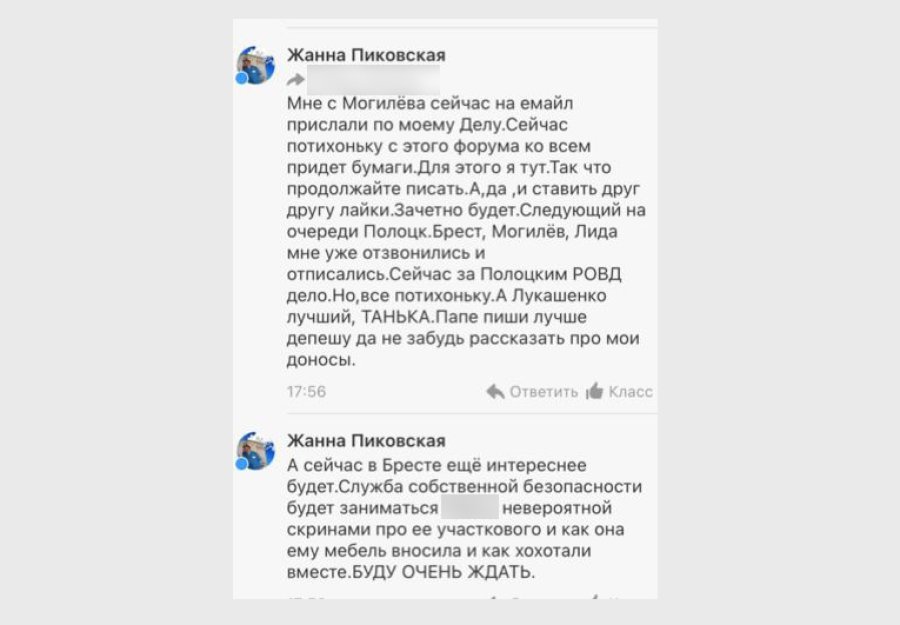 Для преследования политических оппонентов режима Лукашенко Жанна Пиковская коммуницирует в сети Одноклассники с единомышленниками. Они ставят друг другу лайки и поддерживают комментариями.