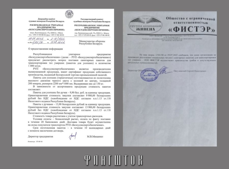 В распоряжении Флагштока оказались документы, в которых указано, что якобы Министерство обороны Беларуси проводит изучение ценовых предложений о закупке «пакетов для транспортировки тел умерших» в количестве 1000 штук. Запрос о предоставлении документов был направлен как минимум в две организации: РУП «БелСудЭкспертОбеспечение» и в компанию, предоставляющую ритуальные услуги, ООО «Фистер».