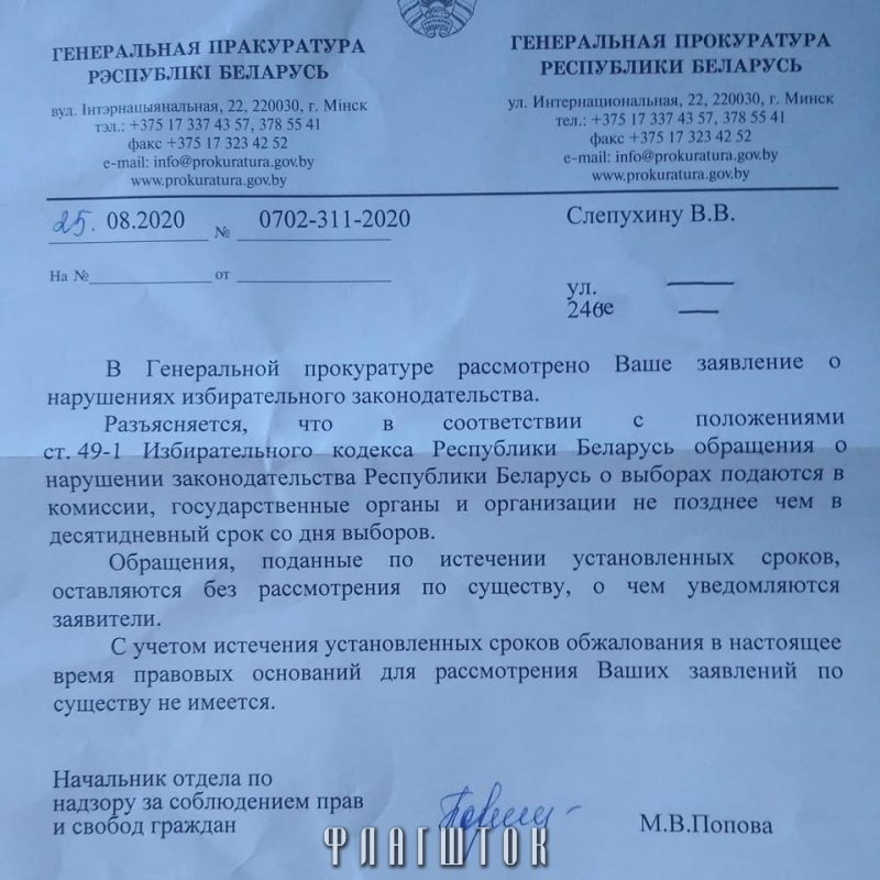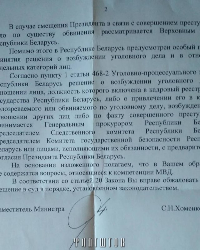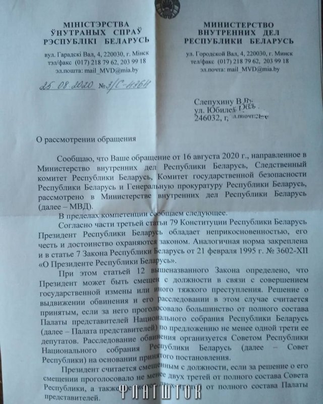 Недавно Валерий Слепухин получил ответ Министерства внутренних дел. В письме за подписью заместителя министра внутренних дел Хоменко подтверждается, что, согласно статьи 12 Закона «О президенте Республики Беларусь», президент может быть смещен с должности в связи с совершением государственной измены или иного тяжкого преступления. Однако решение о выдвижении обвинения и его расследования в этом случае считается принятым, если за него проголосовало большинство от полного состава Палаты представителей Национального собрания Республики Беларусь по предложению не менее одной трети ее депутатов. При этом расследование обвинения организуется Советом Республики Национального собрания Республики Беларусь на основании принятого решения.