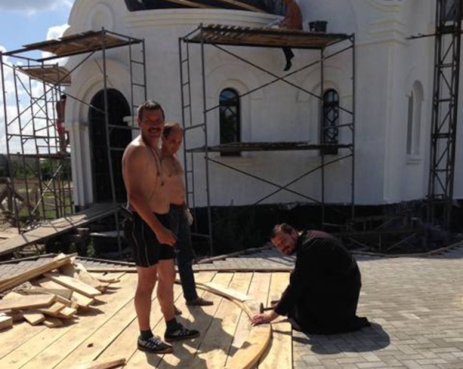 Олег Кинев (слева) на строительстве храма в Гомельской области. Фото: соцсети